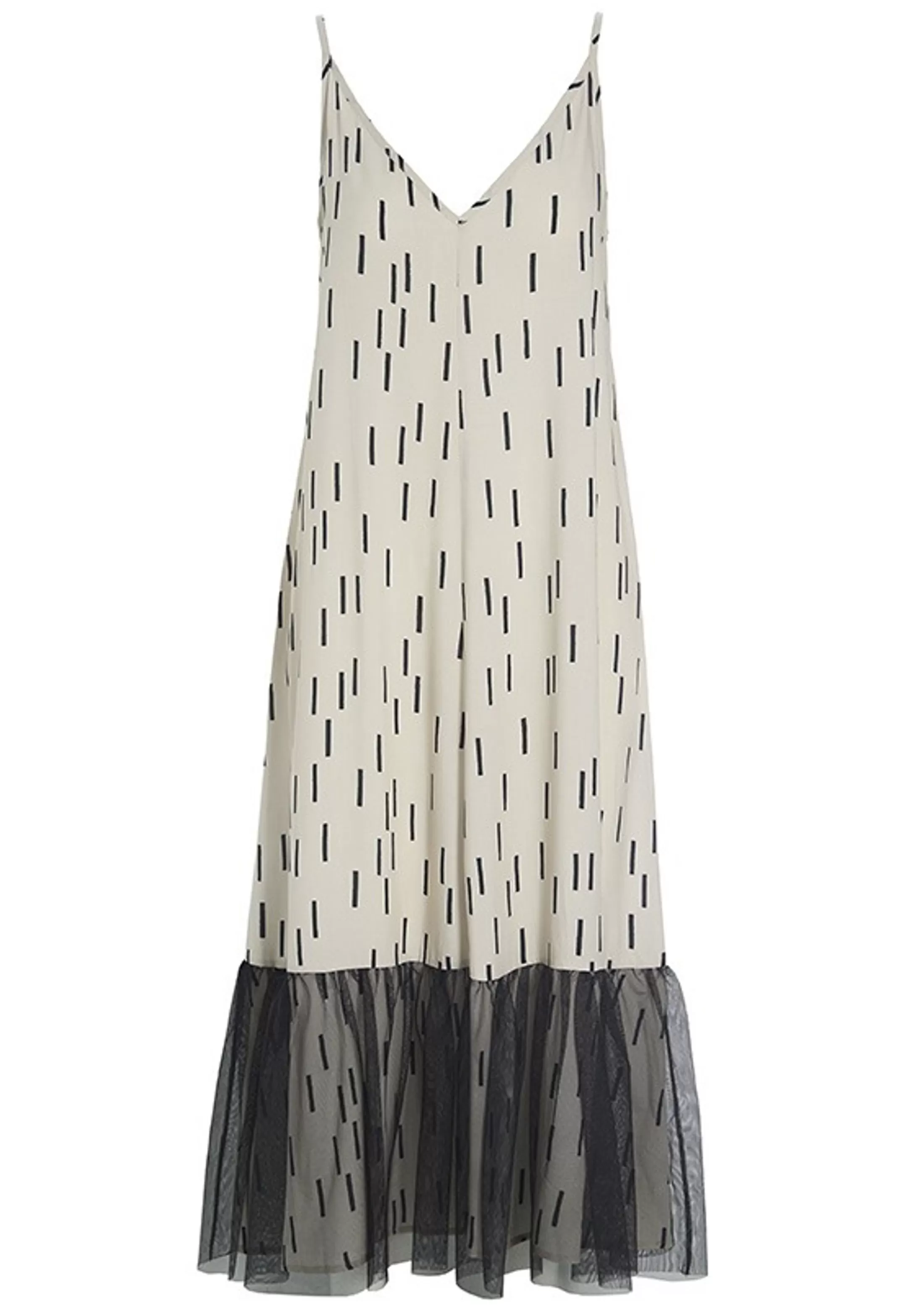 Der Er Fest Og Glade Dage Over Denne Sommerkjole. Det Transparente Lag Af Tyl Forneden Giver En Flot Effekt, Og Monsteret Er Sa Stilfuldt Og Sommerligt. Brug Kjolen Til At Opgradere Hverdagsstilen, Eller Saet Et Par Hoje Haele Til, Og Du Er Klar Til En Middag I Byen.